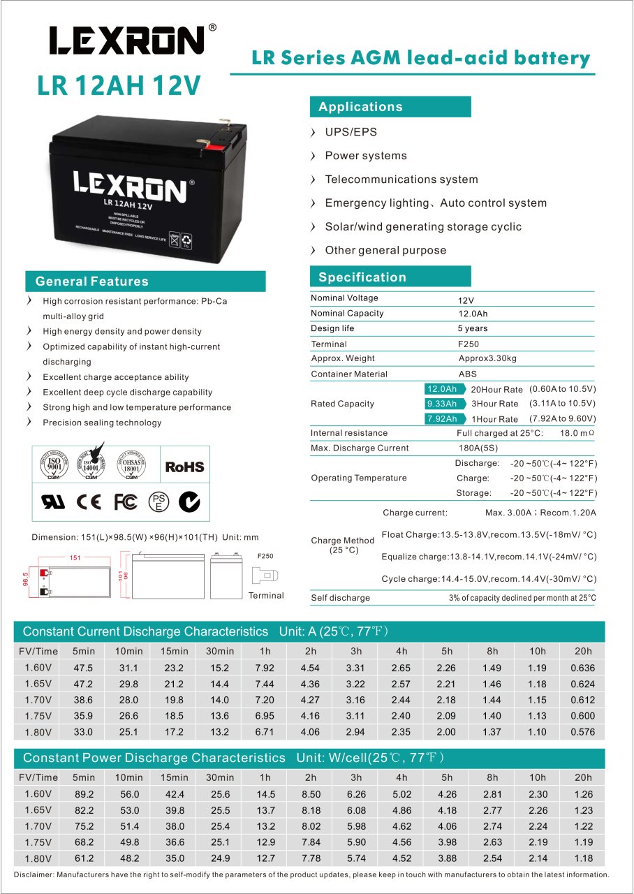Lexron 12AH 12V AGM Akü, güvenlik ve alarm sistemleri, UPS’ler ve acil aydınlatmalar için idealdir. Bakım gerektirmeyen yapısıyla güvenilir ve uzun ömürlü enerji sunar.